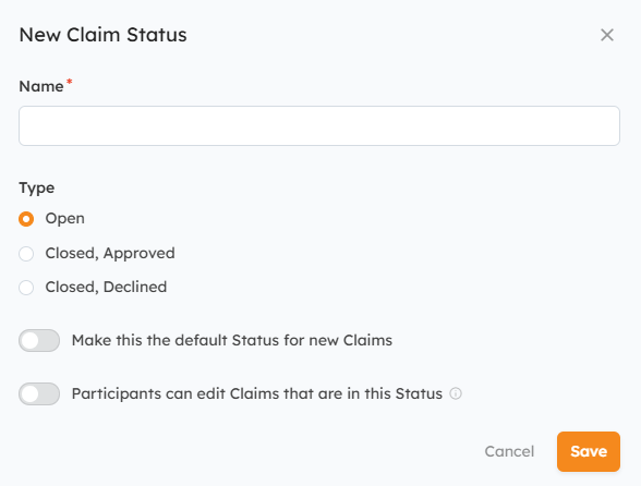 3. In the New Claim Status window, enter a Name for the Status (for example, Submitted, In Review, Approved, or Declined).